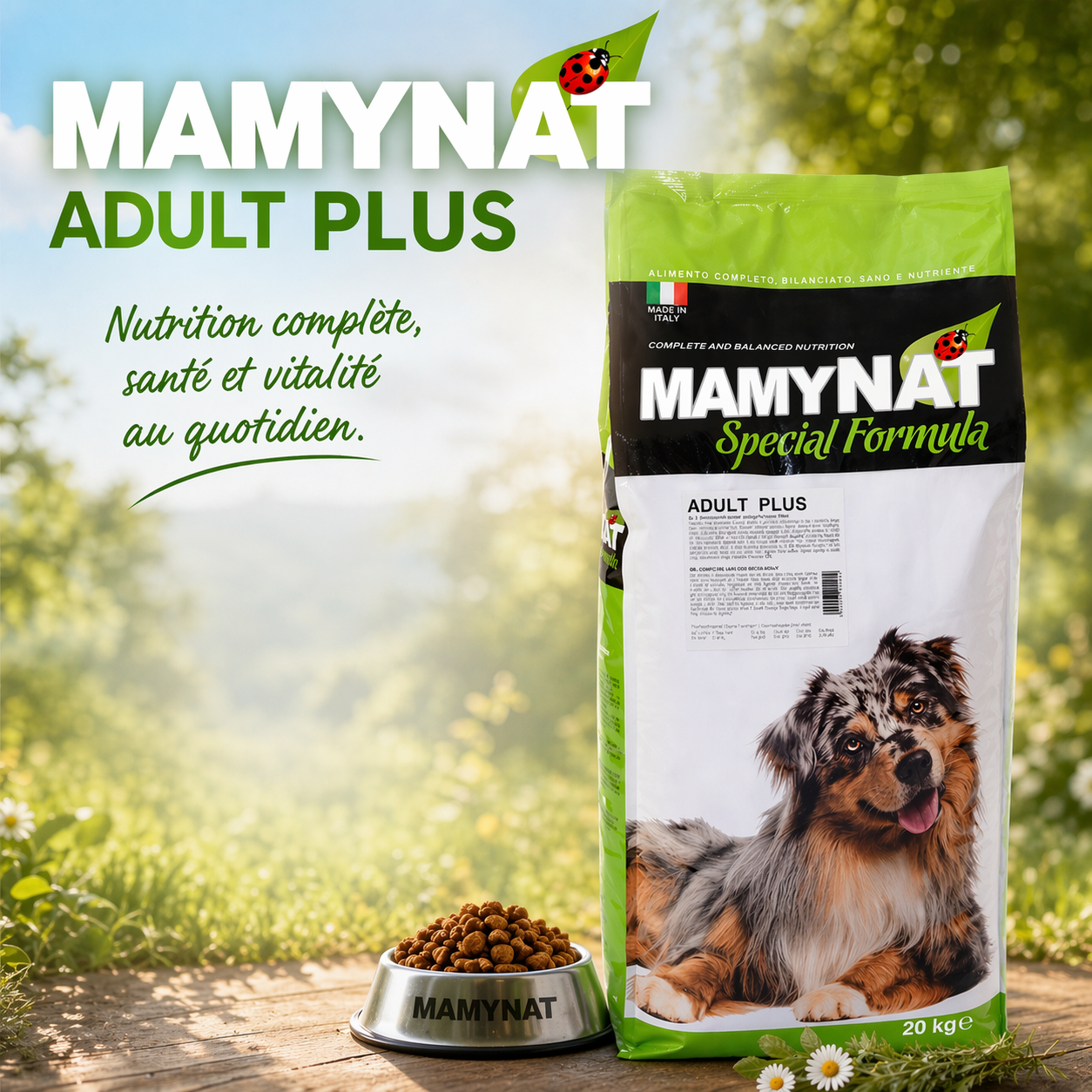 Maïs, viandes déshydratées (30 % dont poulet 20 % et bœuf 10 %, blé, semoule de maïs, graisse de poulet, pulpe de betterave séchée, minéraux.